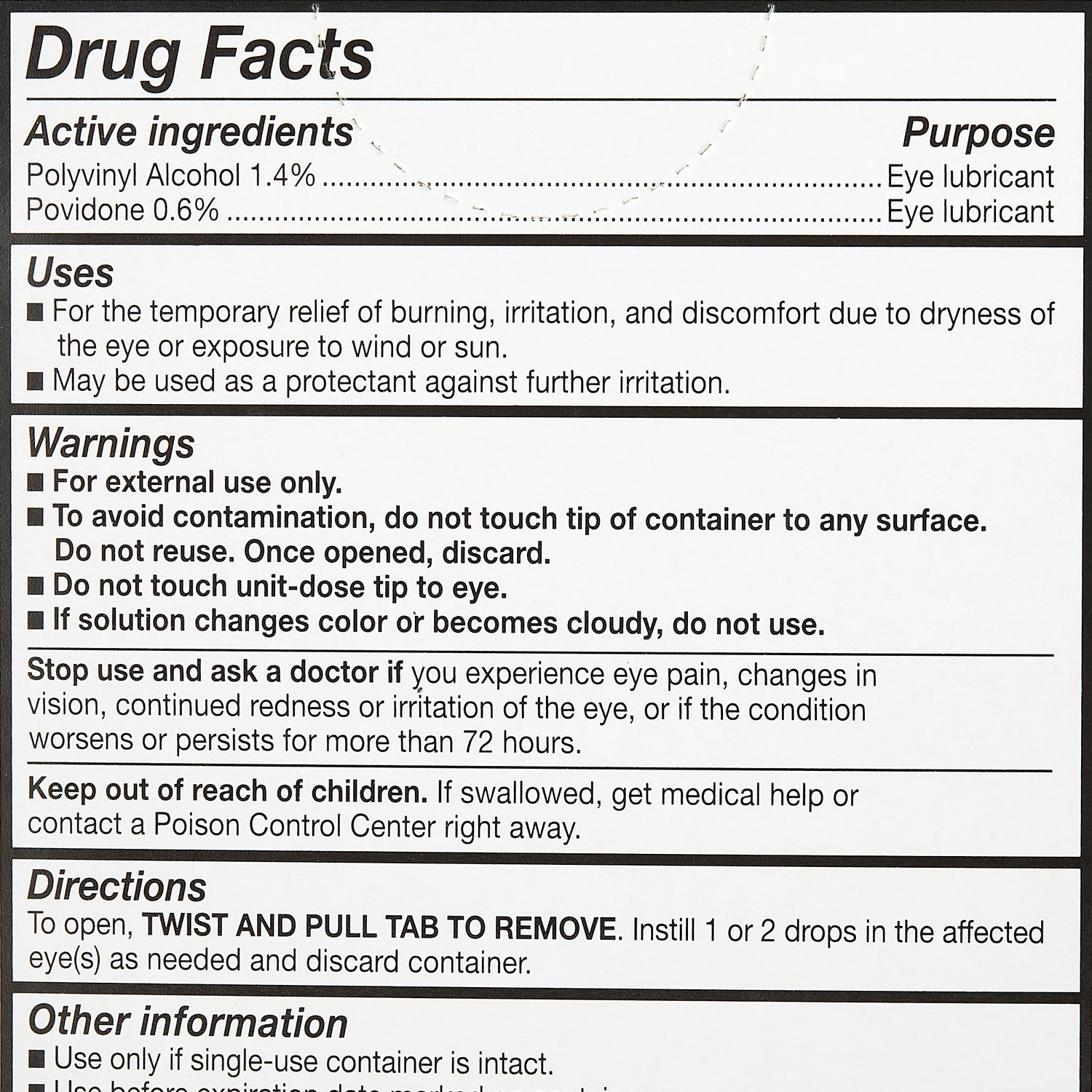 - For the temporary relief of burning, irritation, and discomfort due to dryness of the eye or exposure to wind or sun