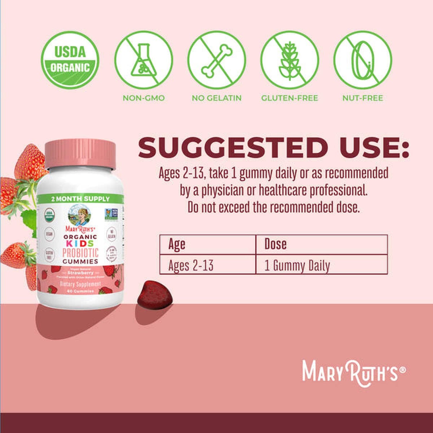 - Strawberry-flavored probiotic gummies indicated to support a healthy gut and immune system