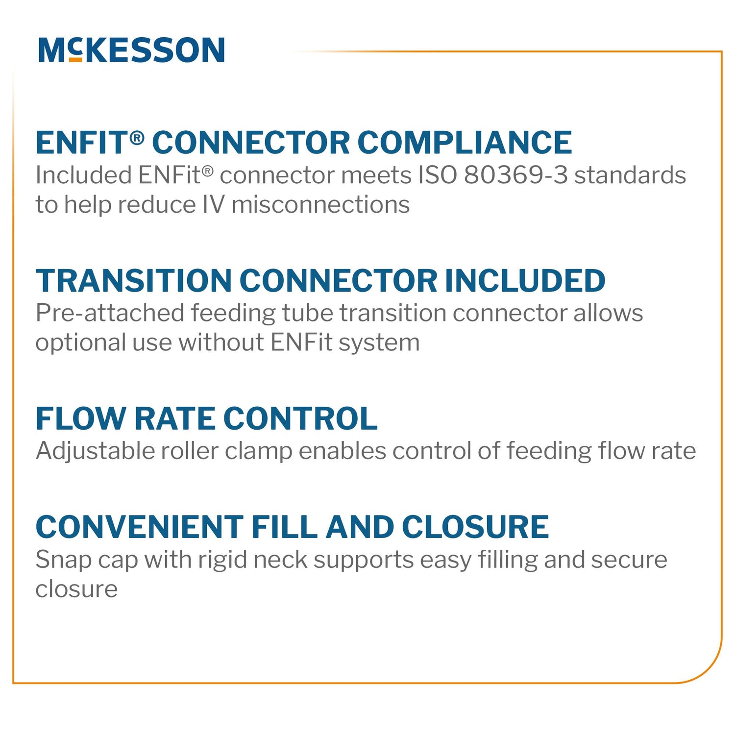 - Included ENFit® connector meets ISO 80369-3 compliancy design standards, improving patient safety by eliminating risks of IV misconnections
