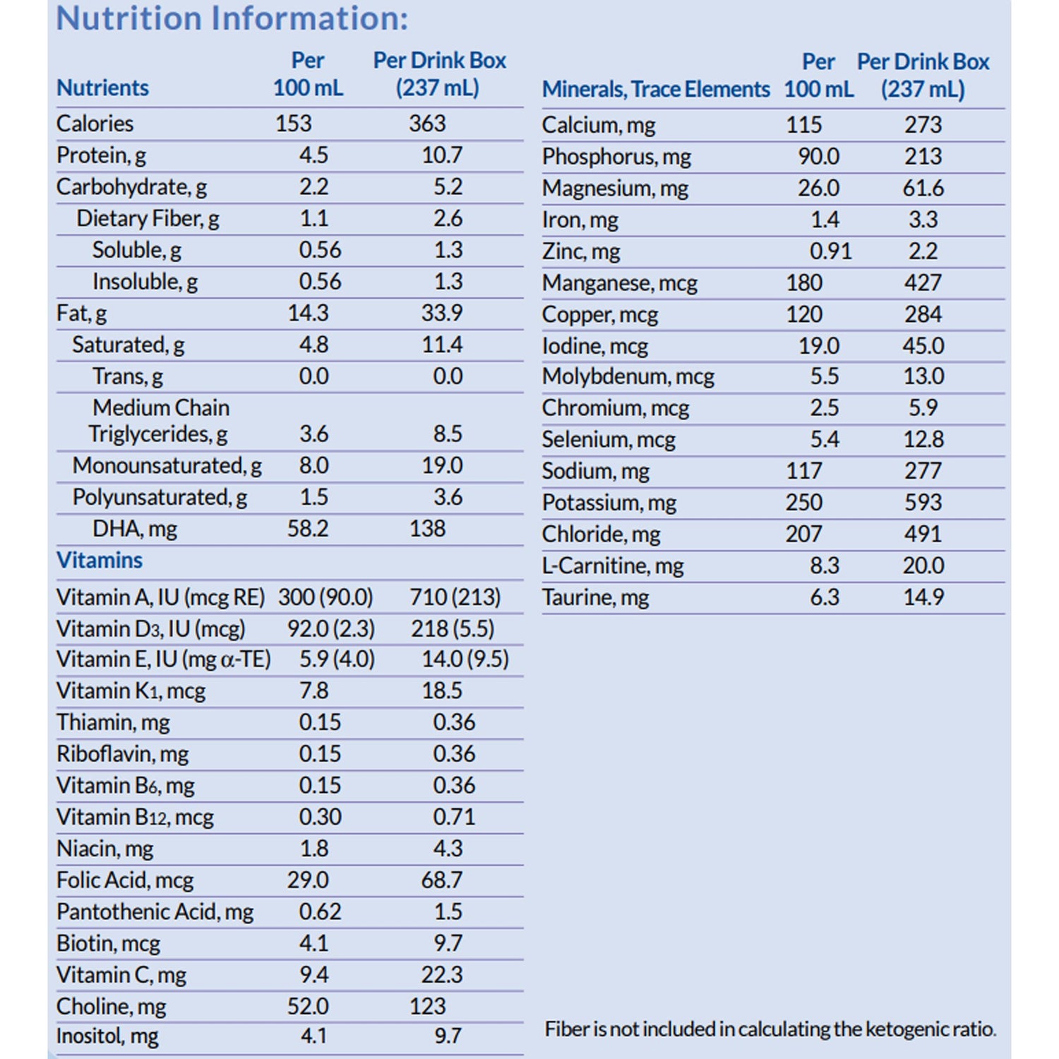 - KetoCal 2.5:1 liquid (LQ) is a ketogenic formula with a 2.5:1 ratio (fat: carbohydrate + protein) with medium chain triglycerides (MCT), DHA and fiber