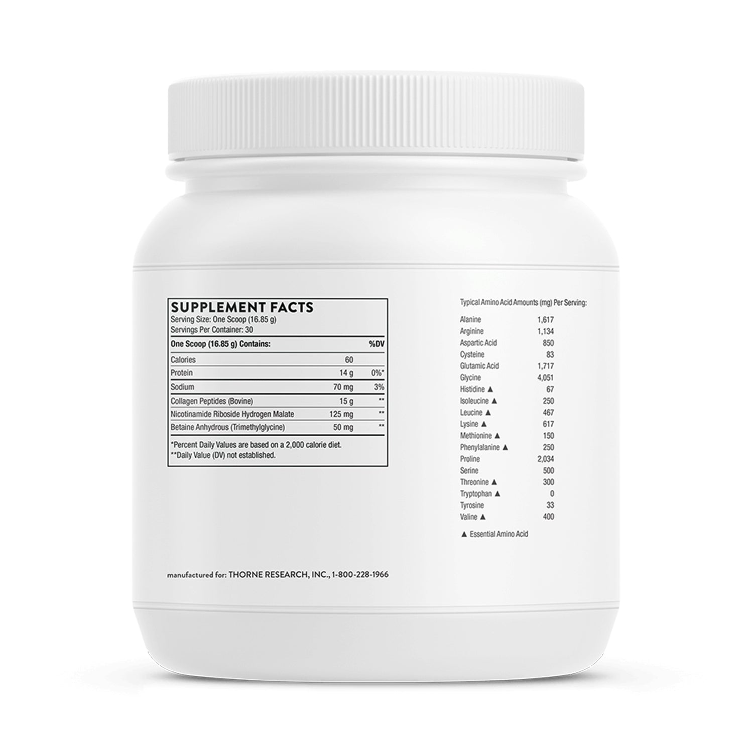 - With collagen peptides that promote joint health and the growth of lean muscle mass, plus nicotinamide riboside (NR) for cellular energy and cellular repair, Thorne’s newest collagen formula keeps you moving from morning to night