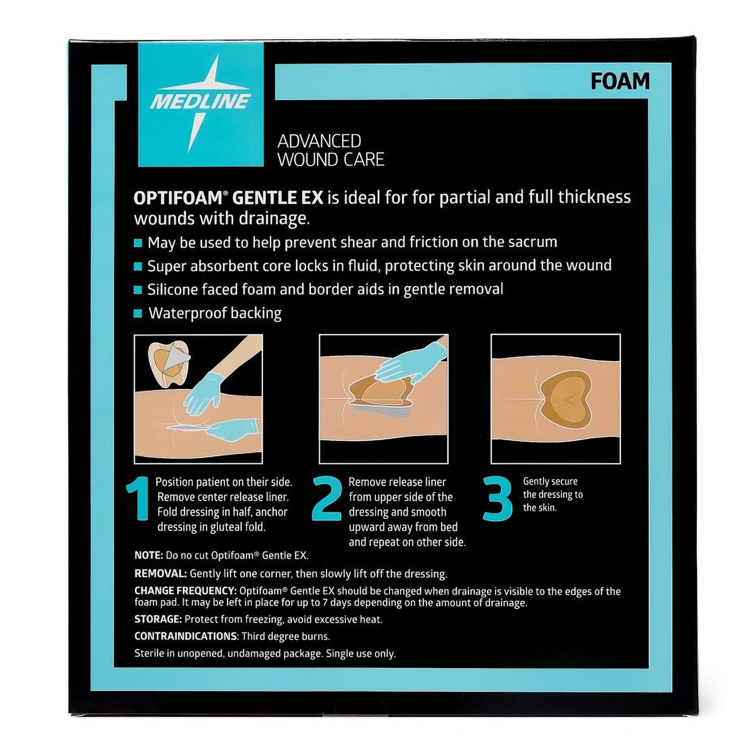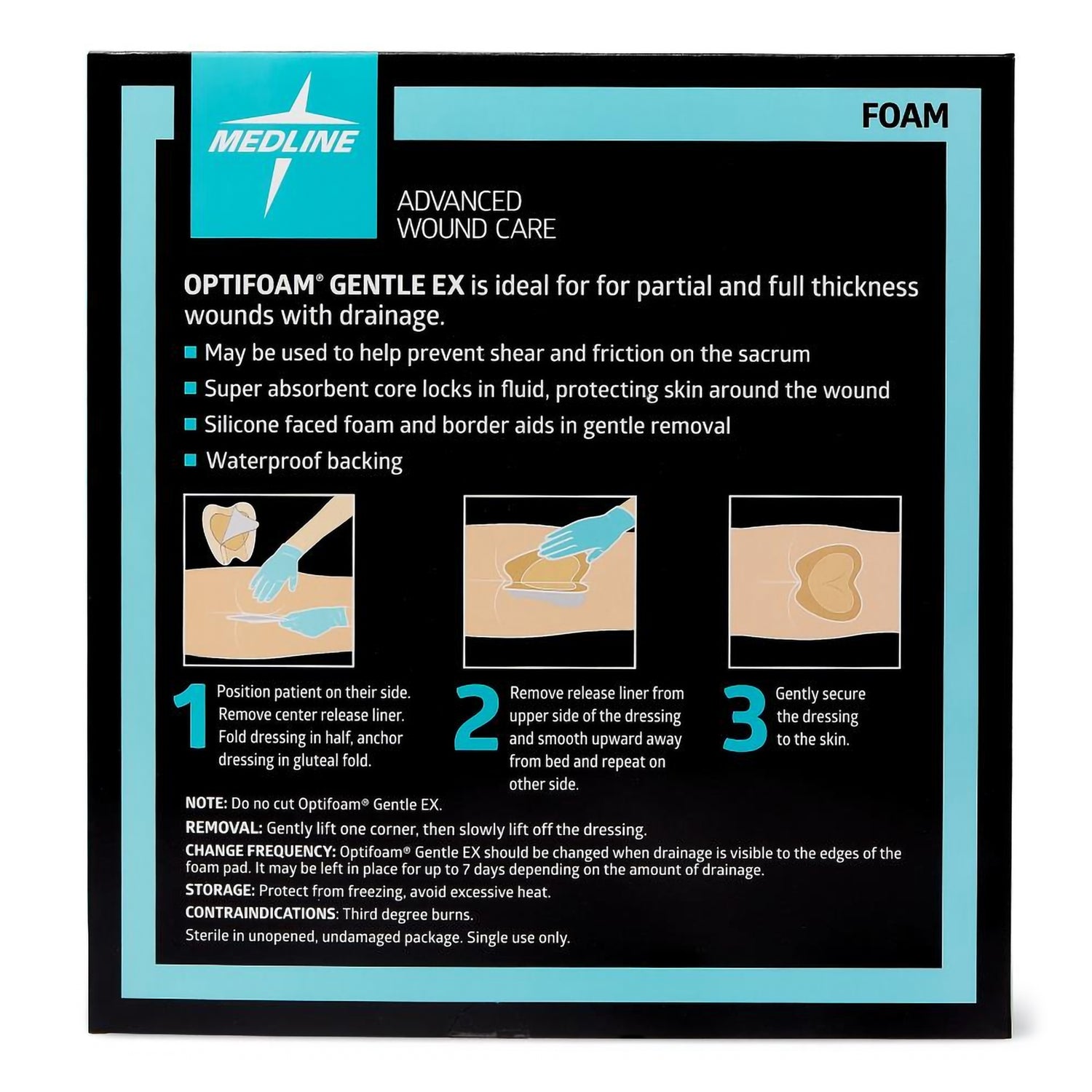 - 5 unique layers with a superabsorbent core that absorbs exudate, converts it into a gel, and locks it away